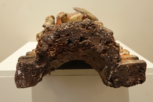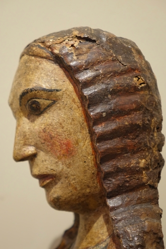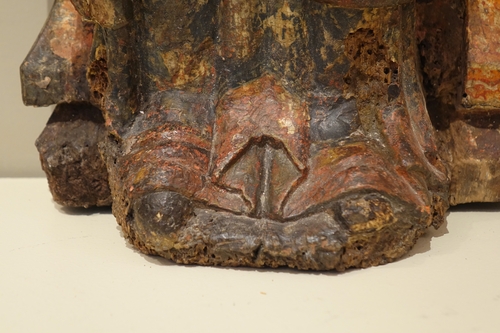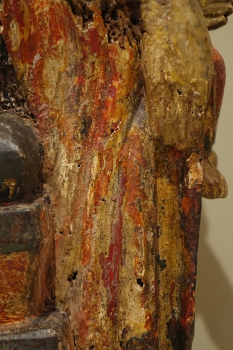Les deux éléments de côté figurant le trône rapportés postérieurement, peut être dû à un dommage lors d’une attaque xylophage .