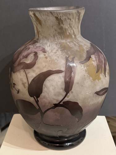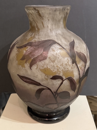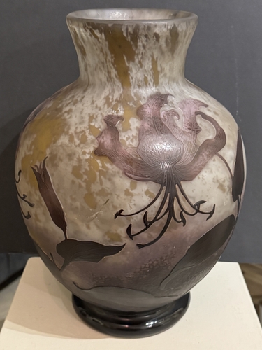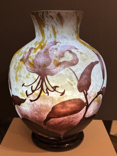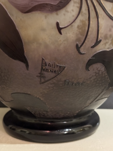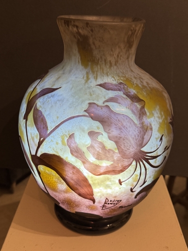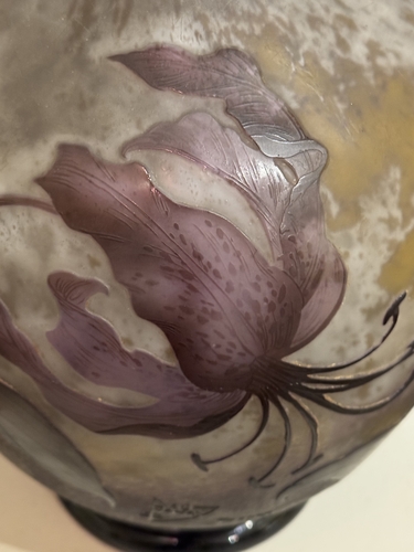 Superbe vase de forme sphérique, représentatif de la production de Daum au début du XXᵉ siècle. Réalisé vers 1914–1915, il témoigne du savoir-faire exceptionnel de la manufacture nancéienne, renommée pour ses décors naturalistes, ses effets de matière subtils et sa maîtrise des techniques telles que le dégagement à l’acide, les reprises à la roue et le travail du verre multicouche.