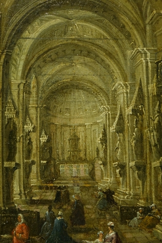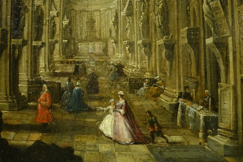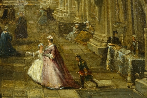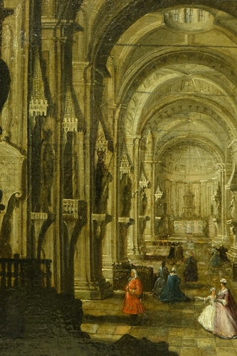 Huile sur toile, rentoilée , représentant un intérieur de cathédrale, sans doute Anvers, avec différentes scènes de genre s’y déroulant.